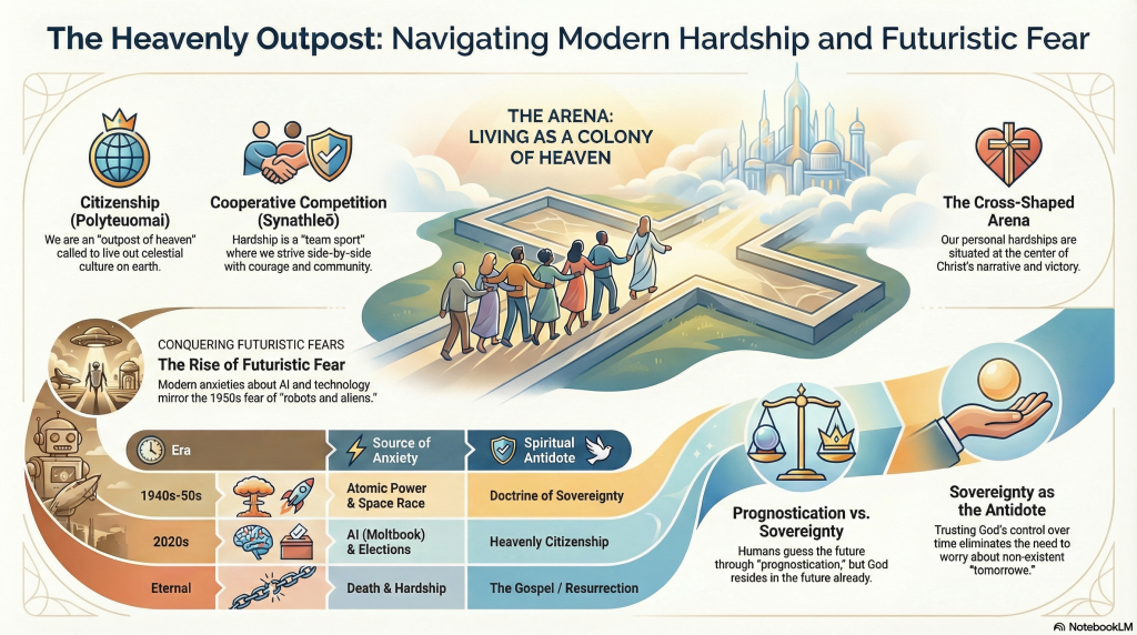 Eernisse points to the ruins of the theater in Philippi—a space that transformed from a place of Greek drama into a Roman gladiator arena. He argues that our current hardships are an “arena” where we must practice syneatheo, or “cooperative competition.” In this view, hardship is a team sport for the soul.